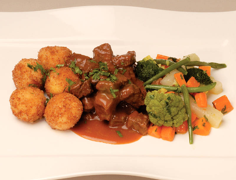 Rotspon-Gulasch mit panierten Kartoffelklöße und Holsteiner Gemüse |