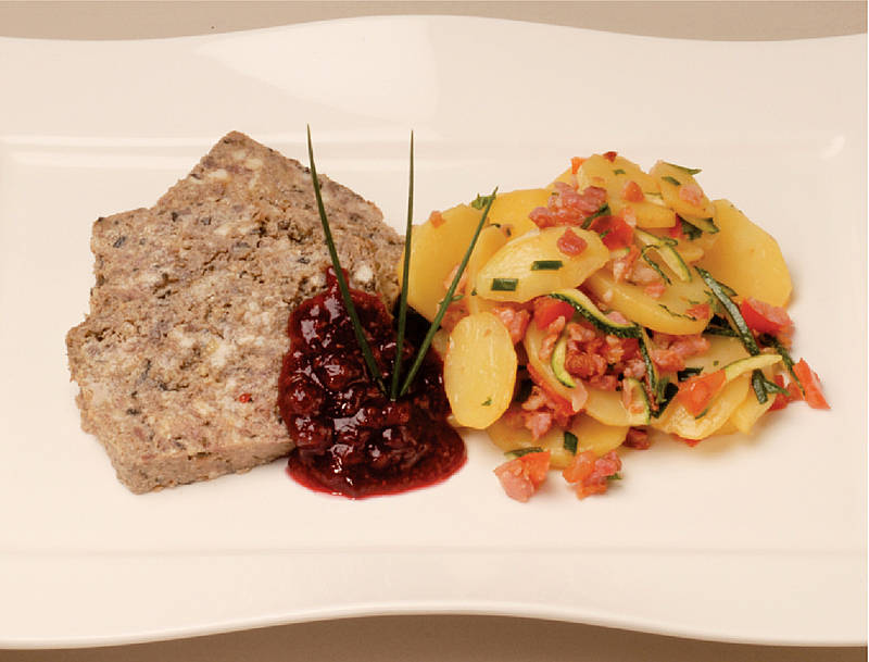 Pikante Pastete von Rind und Schwein auf Specksalat mit fruchtigen Aromies |