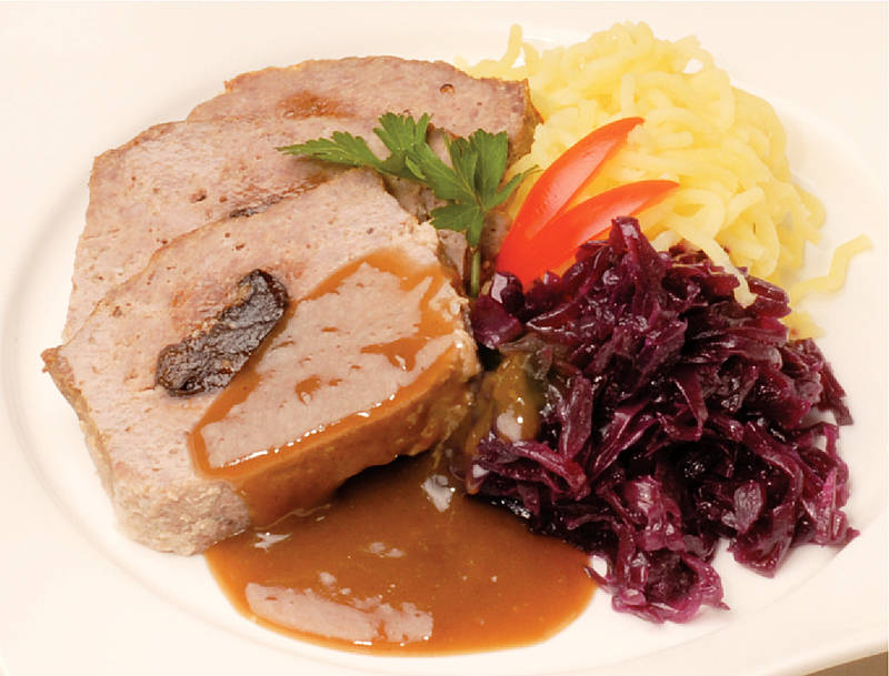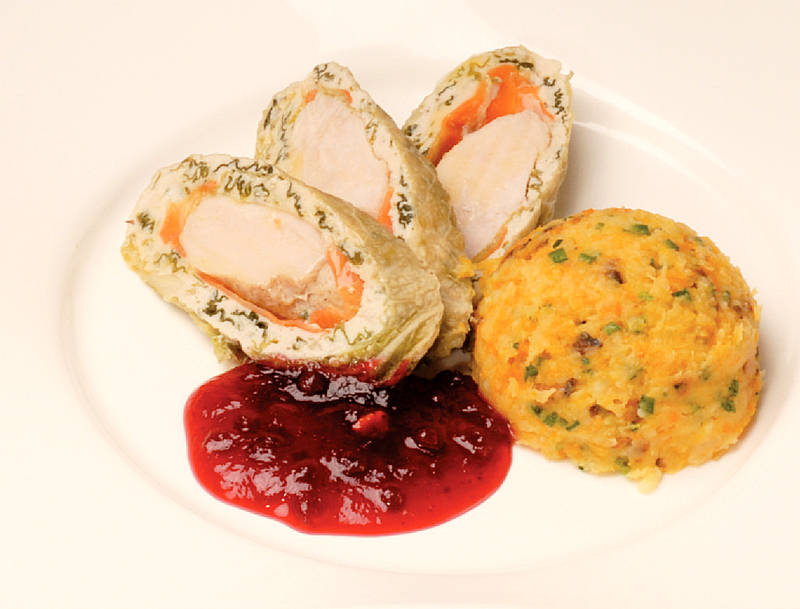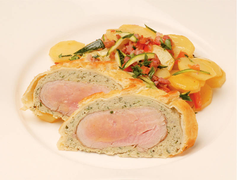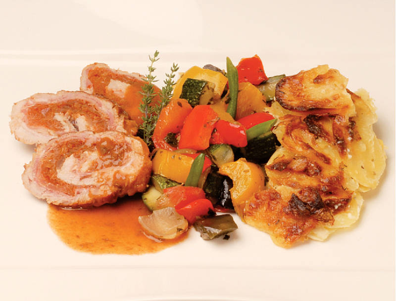 Roulade aus Schweinelachs und Katen-schinken mit Krautfüllung auf Auflaufgemüse |