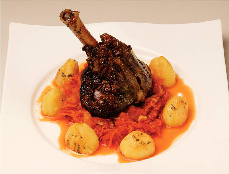 Lammhaxe auf Tomatenkraut mit Rosmarin-Kartoffeln |