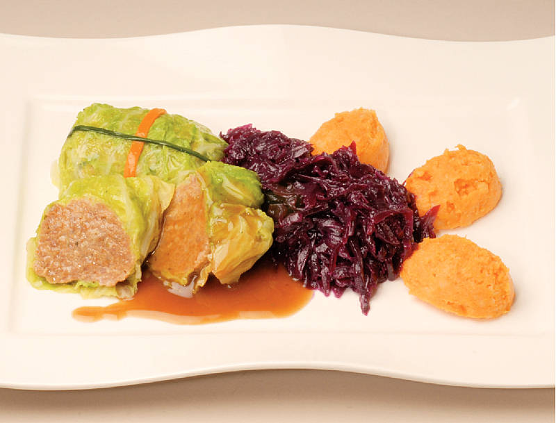 Wirsingwickel mit Lammfüllung, Gemüseklöße und Rotkraut |