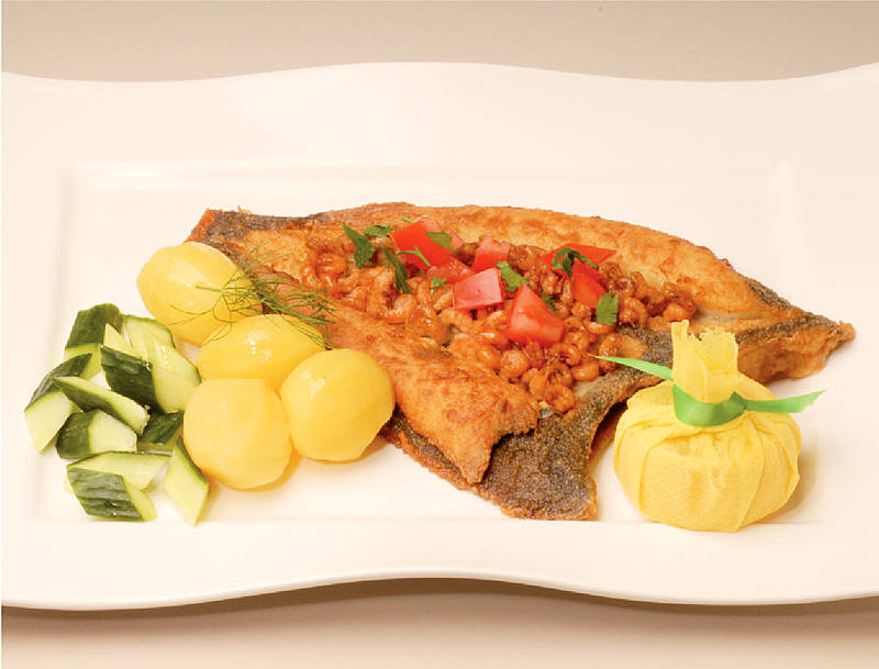 Ostseescholle mit Speckcroutons und Krabben mit Salzkartoffeln |