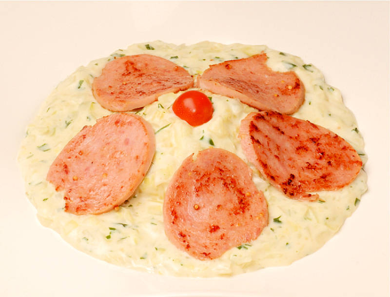 Kalbssauerfleisch geliert auf Bratkartoffeln mit Remoulade und Beilagen süßsauer |