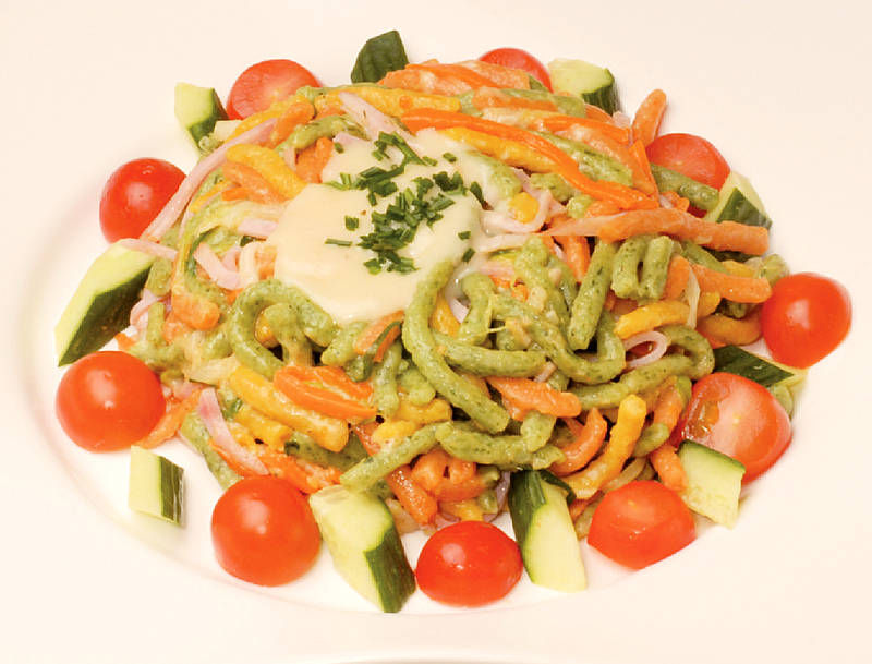 Eiderstedter Gemüsenudeln mit Schinken-Käsesauce und Gemüsestreifen |