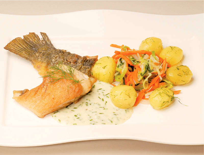 Karpfenfilet mit Petersilienkartoffeln in Meerrettichtunke und Gemüsestreifen |