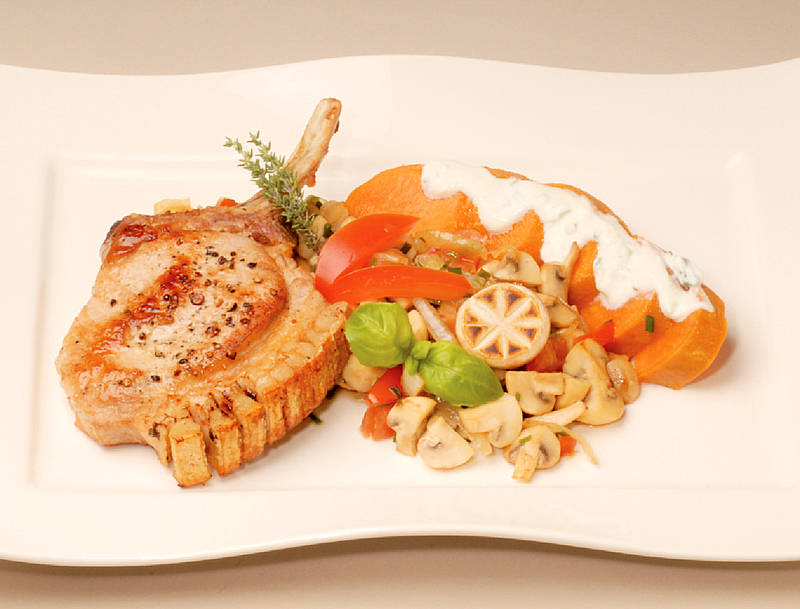 Rippenstück vom Schwein mit Kruste, Dampfkartoffel und Pilz-Zwiebel-Gemüse |