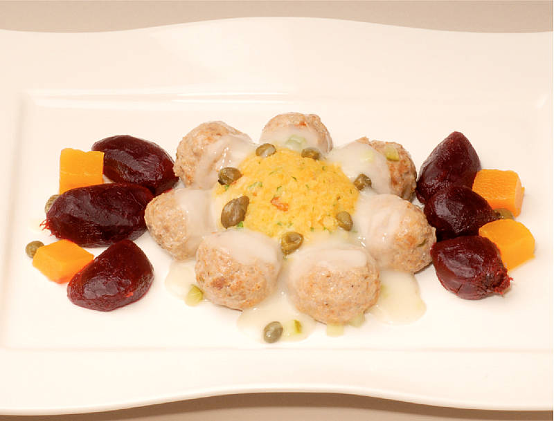 Lammbällchen in Kapernsauce mit Rübenmalheur und Rote Beete |
