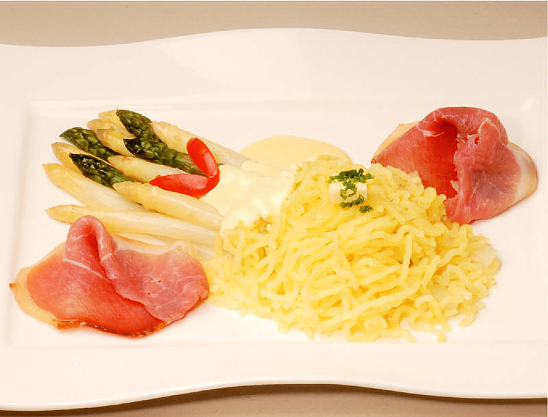 Spargel grün weiß mit Katenschinken, Rahmsoße auf Kräuterstampf |