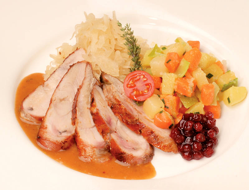 Fasan auf Champagnerkraut mit Auflaufkartoffeln und Aromies-Sauce |