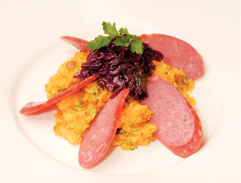 Katenmettwurst auf Rotkohl mit Stampf von Steckrüben, Möhren und Kartoffeln |