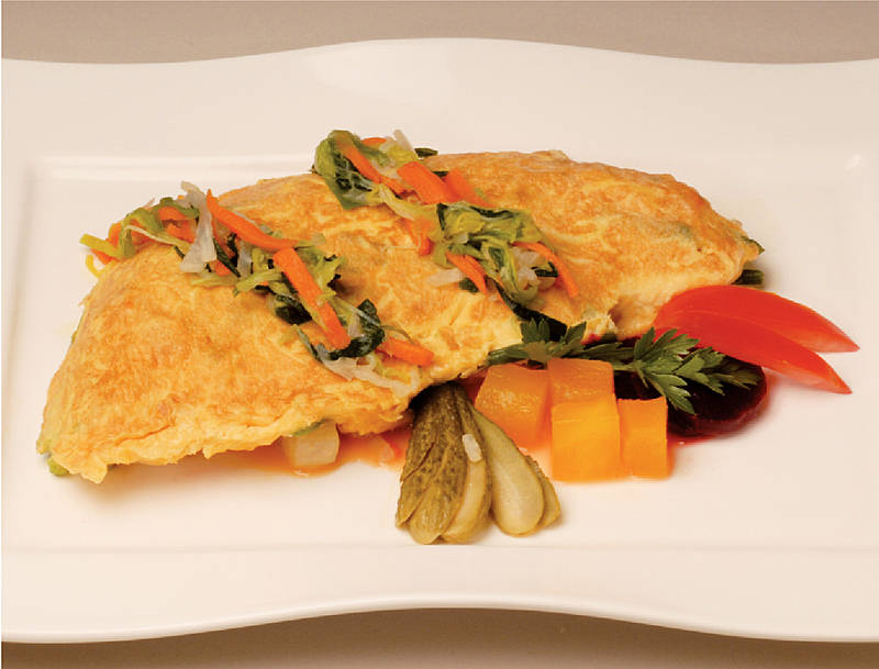 Gemüseomelett auf Mix von Mehlklöße, Kartoffeln und Nudeln mit Röstzwiebeln |