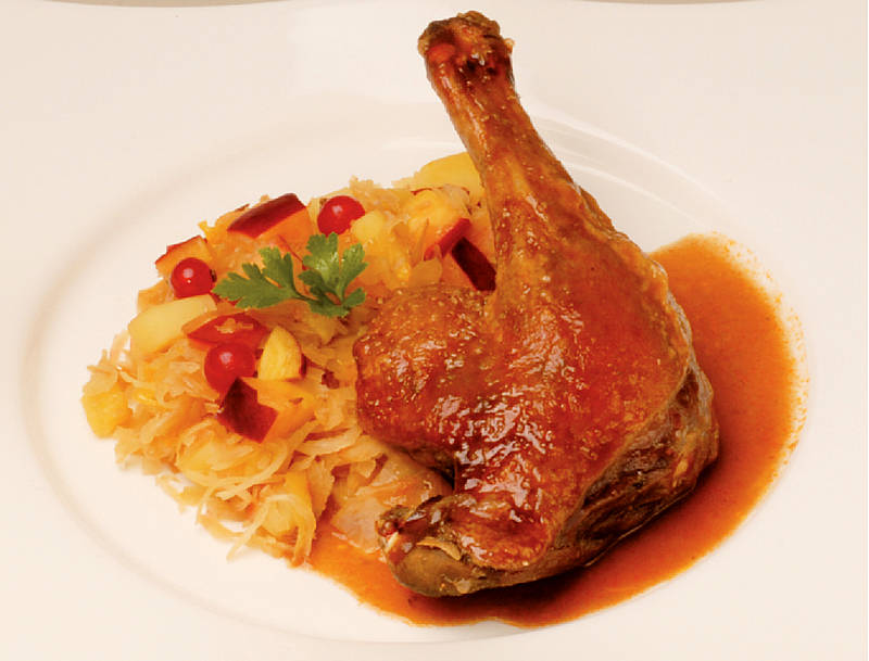 Keule von der holsteiner Mastente auf saisonales Fruchtgemüse |