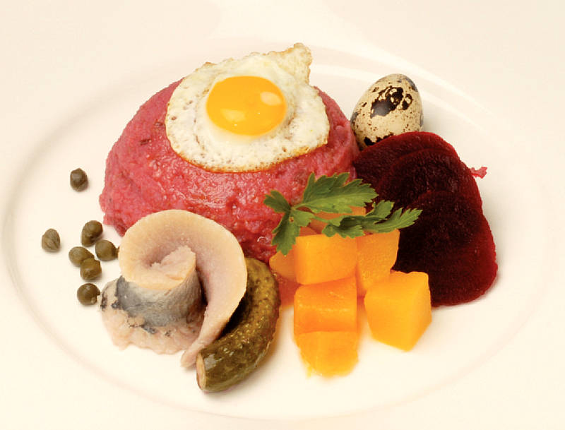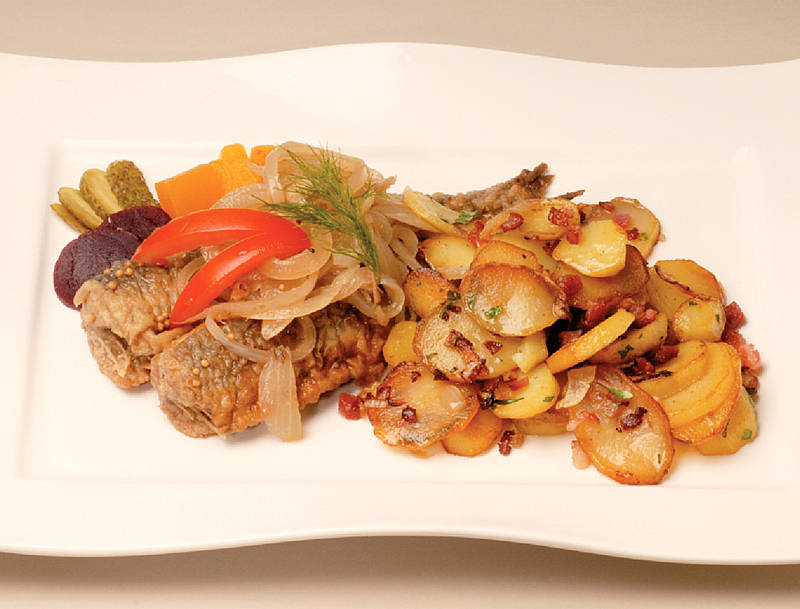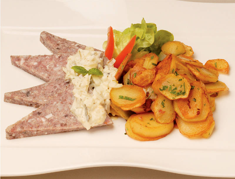 Kalbssauerfleisch geliert auf Bratkartoffeln mit Remoulade und Beilagen süßsauer |
