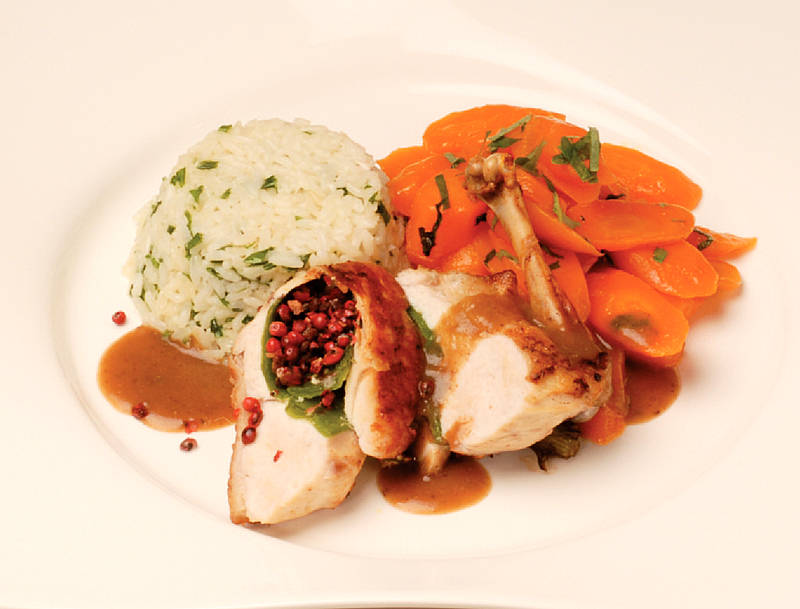 Roulade aus Schweinelachs und Katen-schinken mit Krautfüllung auf Auflaufgemüse |