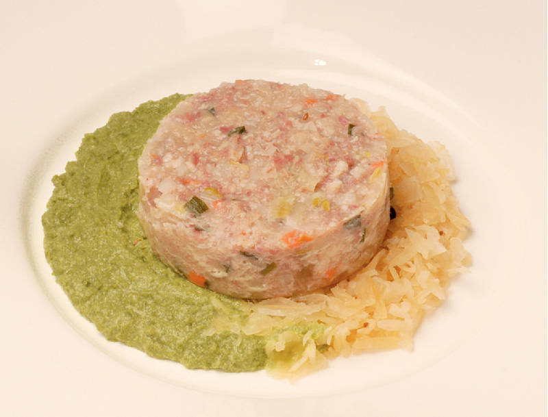Presskopf aus der Kate mit Weißkohl in Milchsauce auf Kartoffelschnee |