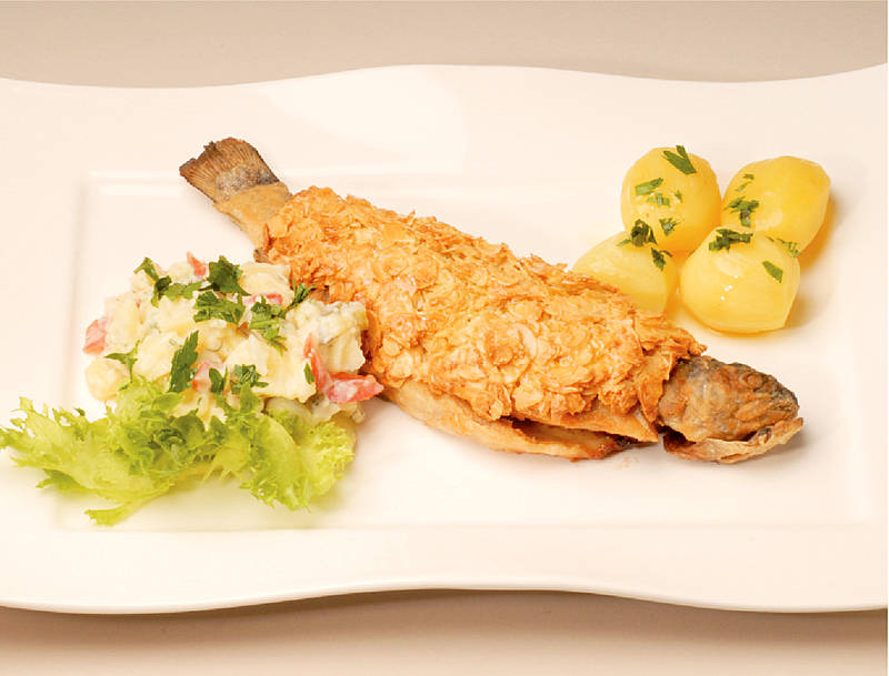 Bachforelle in Mandelkruste, Petersilienkartoffeln und Joghurt-Blattsalat |