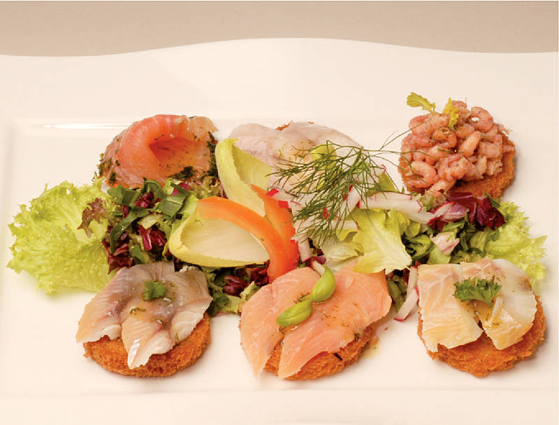Räucherfisch-Taler von Ostund Nordsee auf Blattsalat |