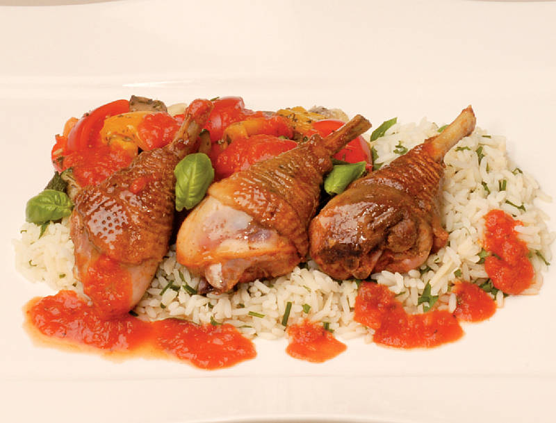 Hähnchenoberkeulen auf Kräuter-Käse-Reis mit Tomatengemüse |