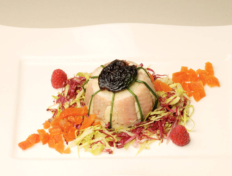 Aalterrine mit Pflaumensoße auf Heusalat |