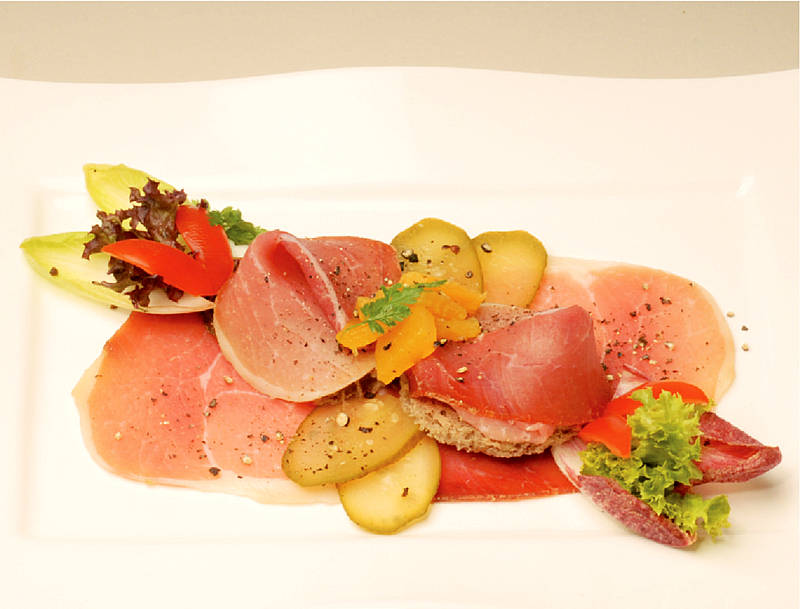 Katenschinken von der Spitze an Gebäckstangen mit Salat |