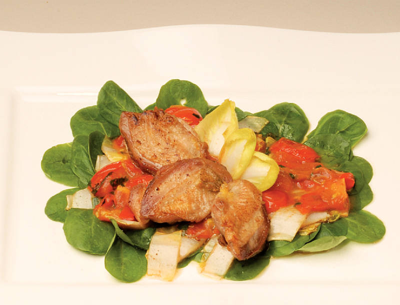 Wachtelbrust auf Tomatengemüse mit Feldsalat |